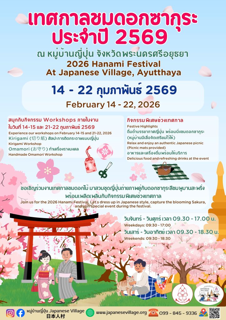 Event Uncategorized เทศกาลชมดอกซากุระ ประจำปี 2569 ณ หมู่บ้านญี่ปุ่น จังหวัดพระนครศรีอยุธยา Thai-Japanese Association/2026-02-04/ Leave a comment Post Views: 11