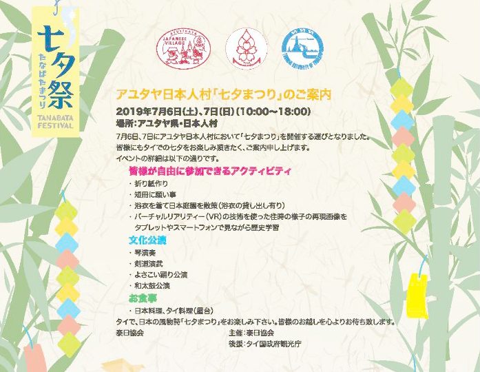 2019年7月6日(土)・7日(日)(10:00~18:) 場所:アユタヤ県・日本人村 7月6日、7日にアユタヤ日本人村において「七夕まつり」を開催する遊びとなりました。 皆様にもタイでの七夕をお楽しみ頂く、ご案内申し上げます。 イベントの詳細は以下の通りです。 皆様が自由に参加できるアクティビティ ・折り紙作り ・短柵に願い事 ・浴衣を着て日本庭園を散策(浴衣の貸し出し有り) ・バーチャルリアリティー(VR)の技術を使った往時の様子の再現画像を タプレットやスマートフォンで見ながら歴史学習 文化公演 ・ 琴演奏 ・剣道演武 ・よさこい踊り公演 ・和太鼓公演 お食事 ・日本料理、タイ料理(屋台) タイで、日本の風物詩「七夕まつり」をお楽しみ下さい。皆様のお越しを心よりお待ち致します。 泰日協会 主催:泰日協会 . 後援:タイ国政府観光庁
